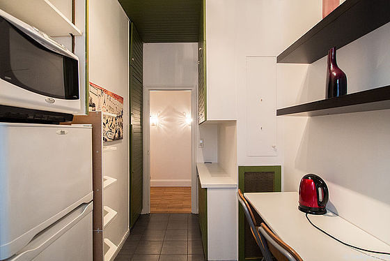 Este apartamento posee una cocina con linoleum en el sueloy todo el equipamiento necesario para su vida diaria : placas eléctricas, refrigerador, micro ondas, campana extractora, hervidor, cafetera, estantería, aparador, 3 silla(s), bar.
