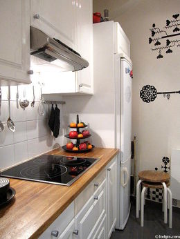 Este apartamento posee una cocinay todo el equipamiento necesario para su vida diaria : placas eléctricas, refrigerador, congelador, horno, horno micro-ondas, campana extractora, tostador, hervidor, cafetera, mesa, armario empotrado, vajilla, electrodomésticos, taburete.