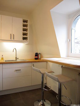 Este apartamento posee una magnífica cocina con azulejo en el sueloy todo el equipamiento indispensable para su vida diaria : placas eléctricas, refrigerador, congelador, horno, micro ondas, campana extractora, tostador, cafetera, armario empotrado, vajilla, 2 silla(s), bar.