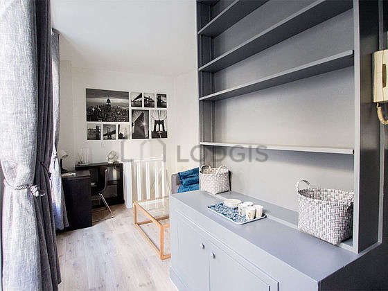 Este dúplex está formado por un salón con coco en el suelo. Este salón tranquilo está amueblado y equipado para que su estancia sea agradable : sofá, mesita, mesa de estudio, estantería, armario empotrado, 1 silla(s), taburete.