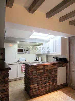 Este apartamento posee una bonito cocina con parquet en el sueloy todo el equipamiento indispensable para su vida diaria : placas eléctricas, refrigerador, congelador, horno, micro ondas, campana extractora, tostador, hervidor, cafetera, estantería, armario empotrado, vajilla.