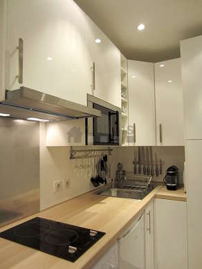 Este apartamento posee una bonito cocina con parquet en el sueloy todo el equipamiento necesario para su vida diaria : placas eléctricas, refrigerador, congelador, horno, micro ondas, campana extractora, tostador, hervidor, cafetera, estantería, armario empotrado.