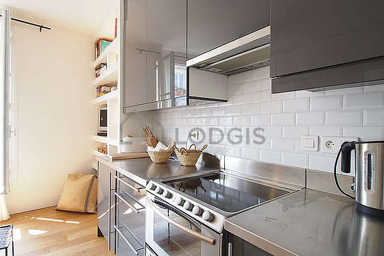 Este apartamento posee una bonito cocina con parquet en el sueloy todo el equipamiento necesario para su vida diaria : placas eléctricas, refrigerador, congelador, horno, campana extractora, tostador, hervidor, cafetera, armario empotrado, vajilla.