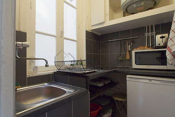 Este apartamento posee una cocina con azulejo en el sueloy todo el equipamiento indispensable para su vida diaria : placas eléctricas, refrigerador, micro ondas, tostador, hervidor, estantería, armario empotrado, vajilla.