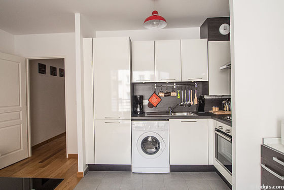 Este apartamento posee una magnífica cocina con azulejo en el sueloy todo el equipamiento esencial para su vida diaria : placas eléctricas, refrigerador, micro ondas, congelador, campana extractora, hervidor, cafetera, armario empotrado, vajilla.