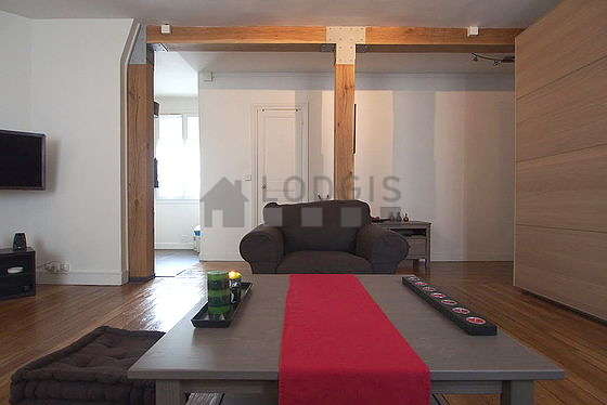 Este apartamento está formado por un salón con parquet en el suelo y ventanas doble acristalamiento y una vista a la calle. Este salón tranquilo está amueblado y equipado para que su estancia sea agradable : televisor, sábanas, edredones, 1 sillones, mesa, mesita, mesa de estudio, armario empotrado, 5 silla(s)1 sofá cama.