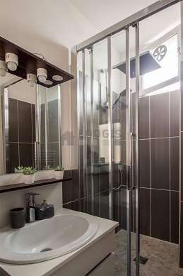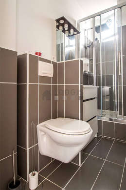 Este apartamento tiene una sala de baño agradable with ventanas. Este baño tiene todo lo necesario para su bienestar diario : toallas, estantería, armario empotrado, ducha, radiador seca-toallas. El WC está integrado en la sala del baño.