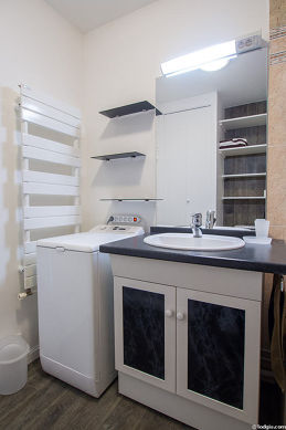 Este apartamento posee una bonito cocina con azulejo en el sueloy todo el equipamiento indispensable para su vida diaria : placas eléctricas, refrigerador, micro ondas, congelador, tostador, hervidor, cafetera, estantería, armario empotrado, vajilla, taburete, bar.