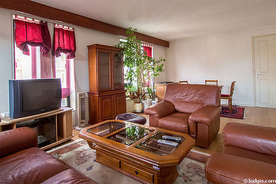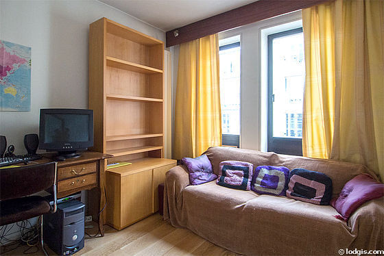 Este apartamento está formado por un salón con parquet en el suelo y ventanas y una vista a la calle. Este salón muy tanquilo está amueblado y equipado para que su estancia sea agradable : televisor, sofá, 2 sillones, mesa, mesita, estantería, aparador, 4 silla(s).