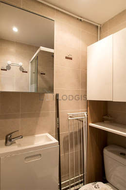Este apartamento posee una cocina con parquet en el sueloy todo el equipamiento esencial para su vida diaria : placas eléctricas, refrigerador, congelador, horno micro-ondas, cafetera, estantería, armario empotrado, vajilla.