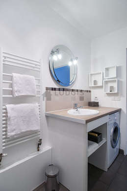 Este apartamento posee una magnífica cocina con azulejo en el sueloy todo el equipamiento indispensable para su vida diaria : placas eléctricas, refrigerador, congelador, horno, micro ondas, campana extractora, tostador, hervidor, cafetera, estantería, armario empotrado, vajilla, taburete, bar.