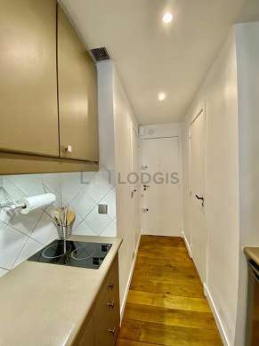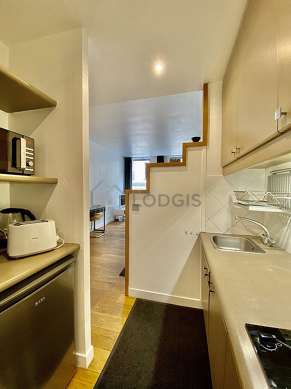 Este apartamento posee una bonito cocina con azulejo en el sueloy todo el equipamiento esencial para su vida diaria : placas eléctricas, refrigerador, horno micro-ondas, congelador, tostador, hervidor, cafetera, armario empotrado.