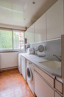 Este apartamento posee una magnífica cocina con azulejo en el sueloy todo el equipamiento esencial para su vida diaria : placas eléctricas, refrigerador, congelador, horno, micro ondas, campana extractora, cafetera, mesa, estantería, armario empotrado, vajilla, taburete.
