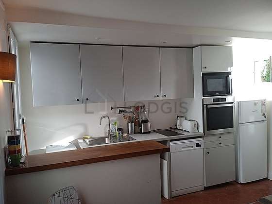 Este apartamento posee una cocina con azulejo en el sueloy todo el equipamiento esencial para su vida diaria : placas eléctricas, refrigerador, congelador, horno micro-ondas, cafetera, estantería, armario empotrado, vajilla, bar.