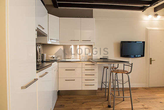 Este apartamento posee una bonito cocina con parquet en el sueloy todo el equipamiento esencial para su vida diaria : placas eléctricas, refrigerador, horno micro-ondas, campana extractora, armario empotrado, vajilla, taburete, bar.