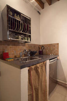 Este apartamento posee una bonito cocina con azulejo en el sueloy todo el equipamiento necesario para su vida diaria : placas eléctricas, refrigerador, micro ondas, congelador, tostador, hervidor, cafetera, estantería, vajilla.