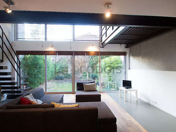 Este dúplex está formado por un salón con cemento en el suelo y ventanas doble acristalamiento y una vista a jardín. Este salón tranquilo está amueblado y equipado para que su estancia sea agradable : televisor, sofá, mesita, ropero, estantería, armario empotrado.