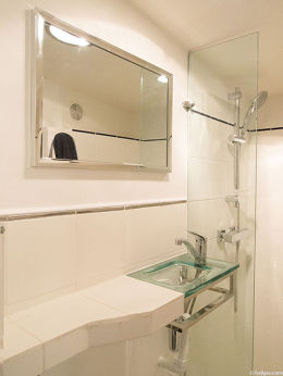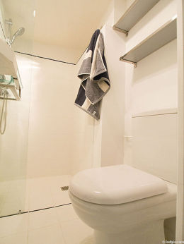 Este apartamento posee una cocina con parquet en el sueloy todo el equipamiento indispensable para su vida diaria : placas eléctricas, refrigerador, horno micro-ondas, tostador, cafetera, estantería, armario empotrado, vajilla.