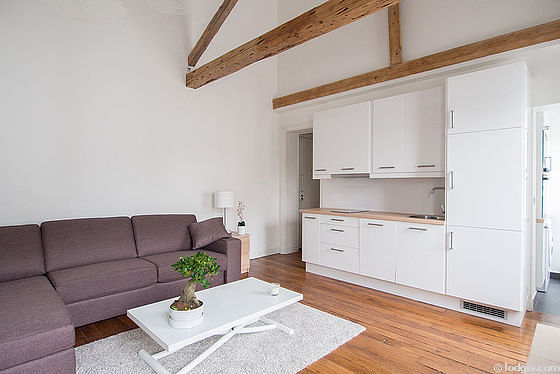 Este apartamento está formado por un salón con moqueta en el suelo y ventanas doble acristalamiento y una vista a al patio. Este salón tranquilo está amueblado y equipado para que su estancia sea agradable : televisor, sábanas, edredones, mesa, mesita, ropero, estantería, armario empotrado, 4 silla(s)1 sofá cama.