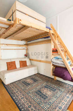Este apartamento está formado por un salón con parquet en el suelo y ventanas doble acristalamiento y una vista a la calle. Este salón tranquilo está amueblado y equipado para que su estancia sea agradable : mesa, ropero, estantería, armario empotrado, 3 silla(s), taburete1 cama en altura, 1 sofá cama.