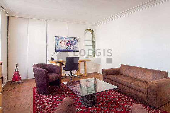Este apartamento está formado por un salón con parquet en el suelo y ventanas doble acristalamiento y una vista a la calle. Este salón tranquilo está amueblado y equipado para que su estancia sea agradable : televisor, 3 sillones, mesa, mesita, ropero, estantería, armario empotrado, 4 silla(s).