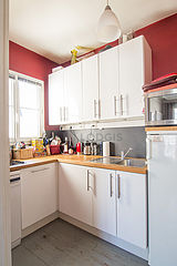 Este apartamento posee una bonito cocina con parquet en el sueloy todo el equipamiento esencial para su vida diaria : placas eléctricas, refrigerador, congelador, horno micro-ondas, congelador, tostador, hervidor, cafetera, estantería, armario empotrado, vajilla.