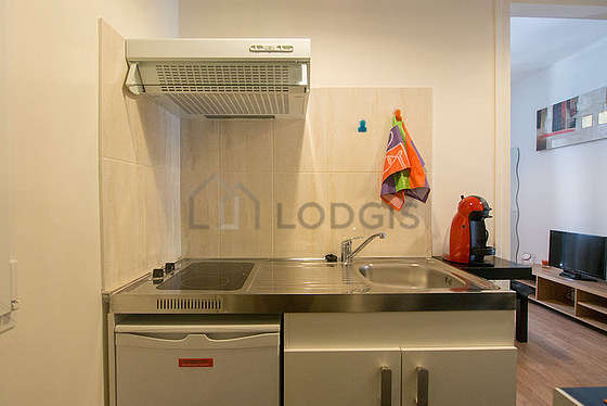 Posee una bonito cocina con azulejo en el sueloy todo el equipamiento necesario para su vida diaria : placas eléctricas, refrigerador, micro ondas, congelador, campana extractora, cafetera, estantería, armario empotrado, vajilla, taburete.