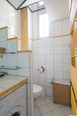 Este apartamento posee una bonito cocina con azulejo en el sueloy todo el equipamiento necesario para su vida diaria : placas eléctricas, refrigerador, congelador, horno, campana extractora, hervidor, estantería, armario empotrado, vajilla.