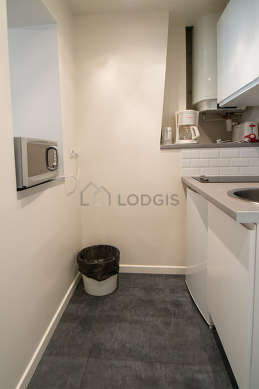 Este apartamento posee una bonito cocina con azulejo en el sueloy todo el equipamiento indispensable para su vida diaria : placas eléctricas, refrigerador, micro ondas, congelador, tostador, hervidor, cafetera, armario empotrado, vajilla.