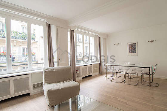 Este apartamento está formado por un salón con parquet en el suelo y ventanas y una vista a la calle. Este salón tranquilo está amueblado y equipado para que su estancia sea agradable : sábanas, edredones, mesa, mesita, 6 silla(s)1 sofá cama, 1 sofá cama.