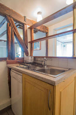 Este apartamento posee una bonito cocina con azulejo en el sueloy todo el equipamiento indispensable para su vida diaria : placas eléctricas, refrigerador, horno, micro ondas, congelador, campana extractora, tostador, hervidor, cafetera, estantería, armario empotrado, vajilla.