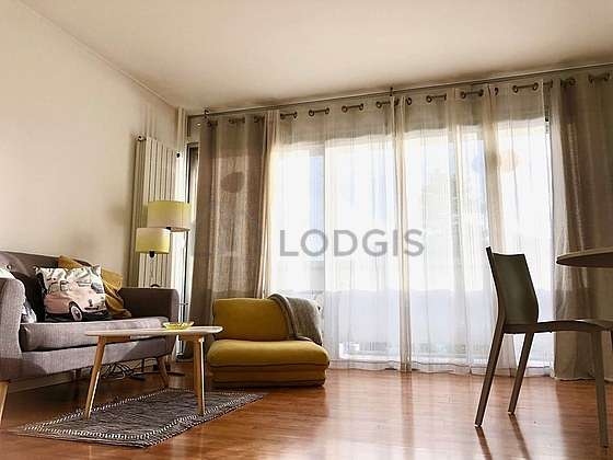 Este apartamento está formado por un salón con parquet en el suelo y ventanas, un balcon y una vista a jardín. Este salón tranquilo está amueblado y equipado para que su estancia sea agradable : televisor, sábanas, edredones, mesa, mesita, taburete1 sofá cama.