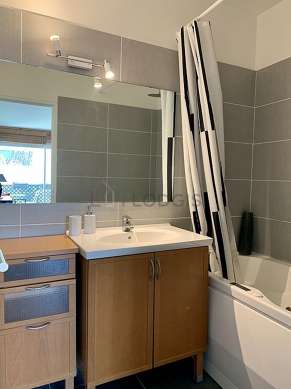 Este apartamento tiene una sala de baño agradable. Este baño tiene todo lo necesario para su bienestar diario : toallas, bañera de hydromasaje, sink. El WC está separado de la sala del baño y ubicado en un espacio independiente.