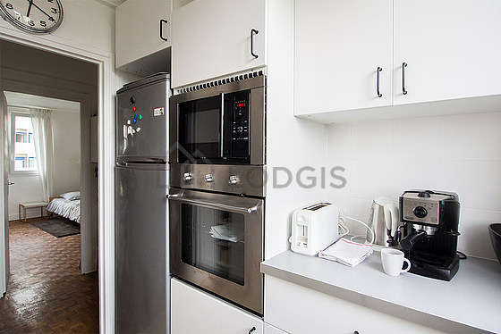 Este apartamento posee una bonito cocinay todo el equipamiento indispensable para su vida diaria : placas eléctricas, refrigerador, congelador, horno, micro ondas, campana extractora, tostador, hervidor, cafetera, estantería, armario empotrado, vajilla, taburete.