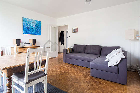 Este apartamento está formado por un salón con parquet en el suelo y ventanas doble acristalamiento y una vista a la calle. Este salón tranquilo está amueblado y equipado para que su estancia sea agradable : mesa, estantería, cómoda, 2 silla(s), taburete1 sofá cama.