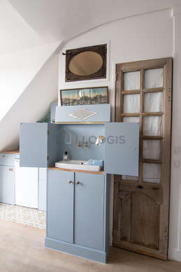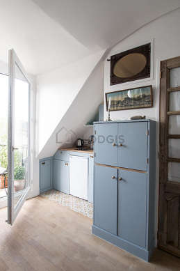 Este apartamento posee una magnífica cocina con azulejo en el sueloy todo el equipamiento indispensable para su vida diaria : placas eléctricas, refrigerador, micro ondas, congelador, tostador, hervidor, cafetera, armario empotrado, vajilla.