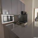 Este apartamento posee una bonito cocina con azulejo en el sueloy todo el equipamiento esencial para su vida diaria : placas eléctricas, refrigerador, horno micro-ondas, congelador, campana extractora, tostador, cafetera, armario empotrado, taburete.