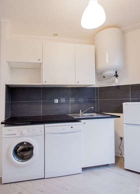 Este apartamento posee una bonito cocina con parquet en el sueloy todo el equipamiento necesario para su vida diaria : placas eléctricas, refrigerador, congelador, horno micro-ondas, estantería, armario empotrado, vajilla.