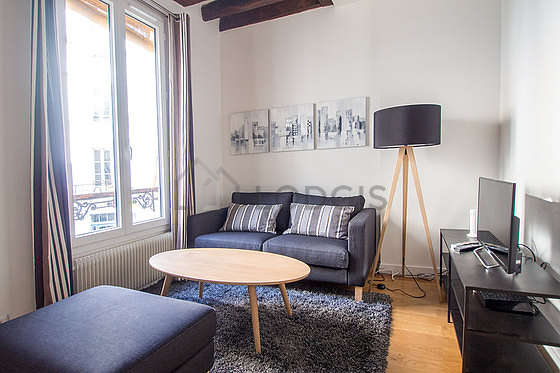 Este apartamento está formado por un salón con parquet en el suelo y ventanas doble acristalamiento y una vista a al patio. Este salón muy tanquilo está amueblado y equipado para que su estancia sea agradable : televisor, sofá, ropero, estantería, armario empotrado, 2 silla(s).