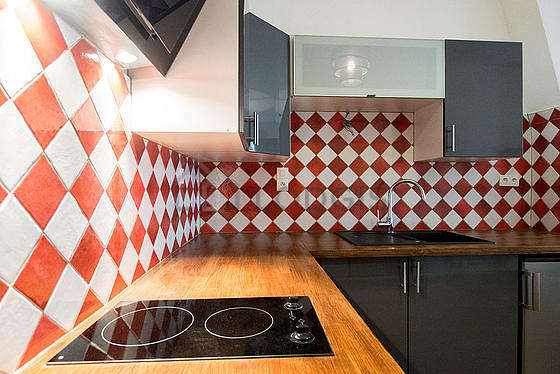 Este apartamento posee una cocina con parquet en el sueloy todo el equipamiento necesario para su vida diaria : placas eléctricas, refrigerador, horno, micro ondas, congelador, campana extractora, tostador, estantería, armario empotrado, vajilla.