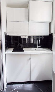 Este apartamento posee una bonito cocina con azulejo en el sueloy todo el equipamiento esencial para su vida diaria : placas eléctricas, refrigerador, micro ondas, congelador, hervidor, cafetera, mesa, armario empotrado, vajilla.
