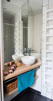 Este apartamento tiene una sala de baño agradable y clara. Este baño tiene todo lo necesario para su bienestar diario : toallas, ducha, secador de pelo, sink, mirror, radiador seca-toallas. El WC está separado de la sala del baño y ubicado en un espacio independiente.