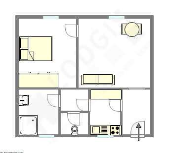 Este apartamento posee una magnífica cocina con azulejo en el sueloy todo el equipamiento indispensable para su vida diaria : placas eléctricas, refrigerador, congelador, horno, micro ondas, tostador, hervidor, cafetera, estantería, armario empotrado, vajilla, bar.