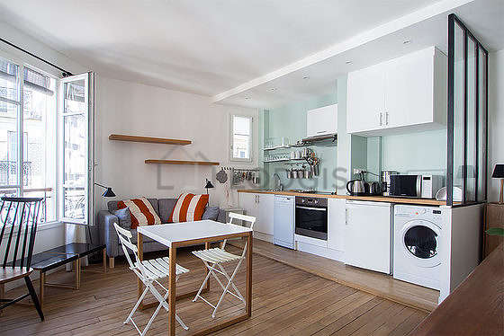 Este apartamento está formado por un salón con parquet en el suelo y ventanas doble acristalamiento y una vista a la calle. Este salón tranquilo está amueblado y equipado para que su estancia sea agradable : sofá, mesa, mesa de estudio, estantería, aparador, 3 silla(s).