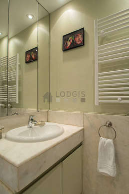 Este apartamento tiene una sala de baño agradable y clara. Este baño tiene todo lo necesario para su bienestar diario : toallas, estantería, ducha, secador de pelo, sink, radiador seca-toallas. El WC está separado de la sala del baño y ubicado en un espacio independiente.