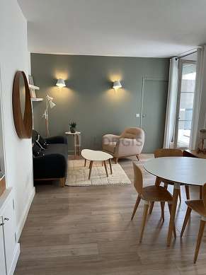 Este apartamento está formado por un salón con parquet en el suelo y ventanas doble acristalamiento y una vista a al patio. Este salón muy tanquilo está amueblado y equipado para que su estancia sea agradable : televisor, sofá, 2 sillones, mesa, mesita, mesa de estudio, estantería, 5 silla(s).