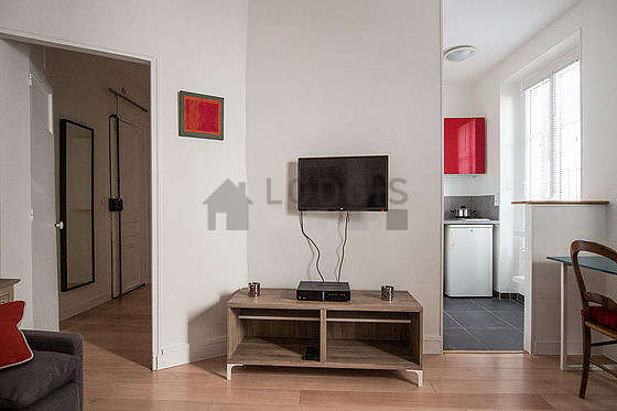 Este apartamento está formado por un salón con parquet en el suelo y ventanas doble acristalamiento y una vista a al patio. Este salón muy tanquilo está amueblado y equipado para que su estancia sea agradable : televisor, sábanas, edredones, mesa de estudio, ropero, estantería, armario empotrado, 3 silla(s), taburete1 sofá cama.