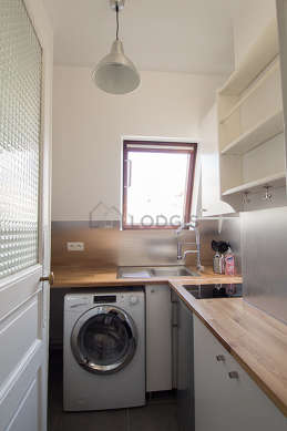 Este apartamento posee una magnífica cocina con azulejo en el sueloy todo el equipamiento indispensable para su vida diaria : placas eléctricas, refrigerador, horno micro-ondas, congelador, hervidor, cafetera, estantería, armario empotrado, vajilla.