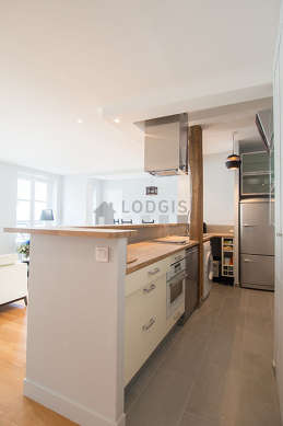 Este apartamento posee una magnífica cocina con azulejo en el sueloy todo el equipamiento necesario para su vida diaria : placas eléctricas, refrigerador, congelador, horno, micro ondas, campana extractora, estantería, armario empotrado, vajilla, bar.
