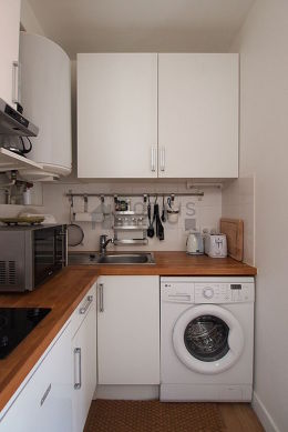 Este apartamento posee una bonito cocina con parquet en el sueloy todo el equipamiento necesario para su vida diaria : placas eléctricas, refrigerador, congelador, horno micro-ondas, campana extractora, tostador, hervidor, cafetera, estantería, armario empotrado, vajilla.